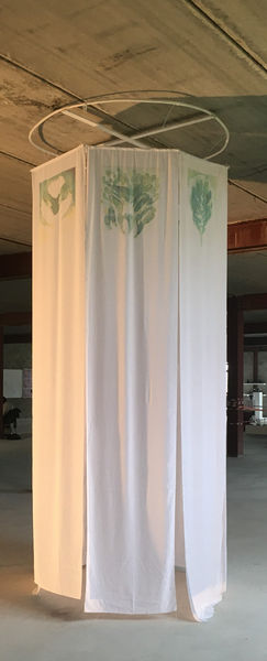 They hang in a circle, requiring the viewer to 'part the veil' in order to interact with the work.